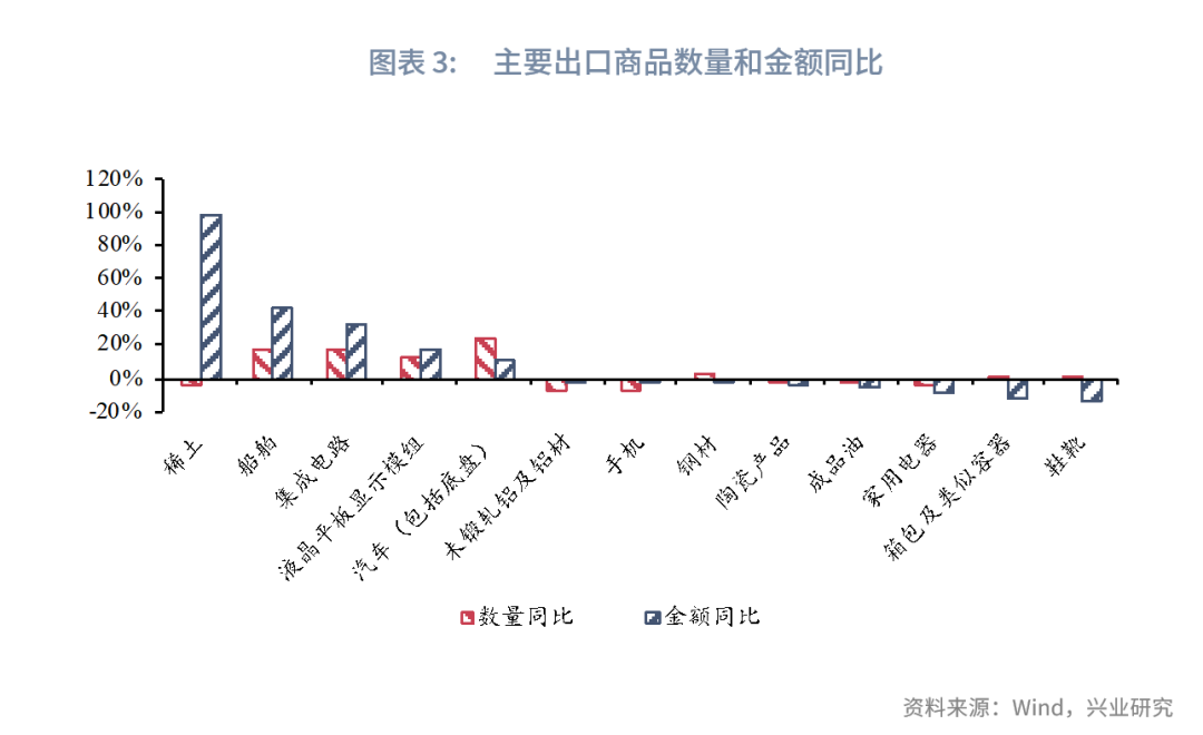 分产品来看,集成电路、船舶仍是拉动出口增长的主要产品。9月我国集成电路、船舶出口分别拉动整体出口1.6和0.7个百分点,较前月提高0.1和0.2个百分点。其他主要出口产品中,手机、自动数据处理设备及其零部件出口降幅有所收窄,对整体出口的拖累分别较上月收窄0.4和0.2个百分点。手机出口金额增速的回升一定程度上来自出口价格的回升,不同于之前出口数量同比大于出口金额,9月手机的出口金额同比已大于出口数量同比。9月稀土出口金额录得大幅增长,当月同比达到97.2%,较上月提高了61.5个百分点。