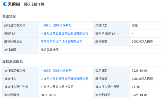 红星资本局10月15日消息,据天眼查披露信息显示,10月9日,大连万达商业管理集团股份有限公司(以下简称“大连万达商管集团”)新增两则股权冻结信息,股权所在企业分别为广州万达广场投资有限公司、齐齐哈尔万达广场投资有限公司,冻结股权数额分别为1亿元、5000万元,合计1.5亿元,冻结期限自2025年10月9日至2028年10月8日,执行法院均为成渝金融法院。