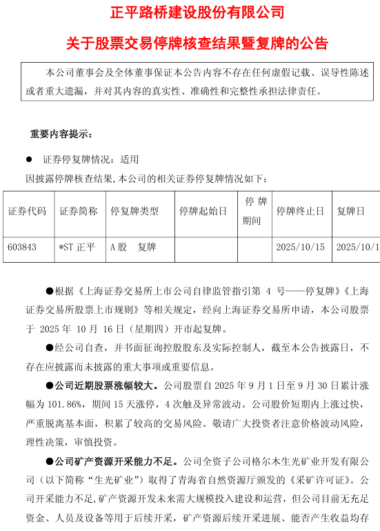10月15日晚,*ST正平公告,近日,公司就股票交易情况进行核查,鉴于相关核查工作已完成,经向上交所申请,公司股票将于10月16日(星期四)开市起复牌。
