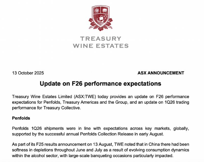 富邑集团调低了2026财年奔富的增长预期。(截图来源:公司公告)