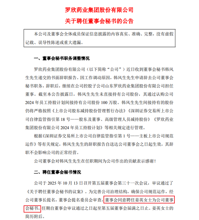 10月13日,罗欣药业(002793.SZ)公告称,因工作调动原因,韩风生辞去董事会秘书职务,董事会审议通过决定聘任姜英为公司董事会秘书。姜英在此之前曾在公募机构国泰基金担任基金经理,2024年离任,如今从基金经理转向上市公司,相当于换了新的“赛道”。