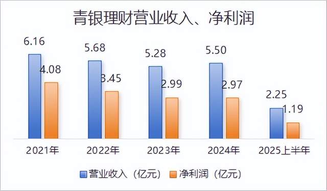 上半年,青银理财营业收入、净利润分别为2.25亿元、1.59亿元,同比分别下降30.98%、14.05%。