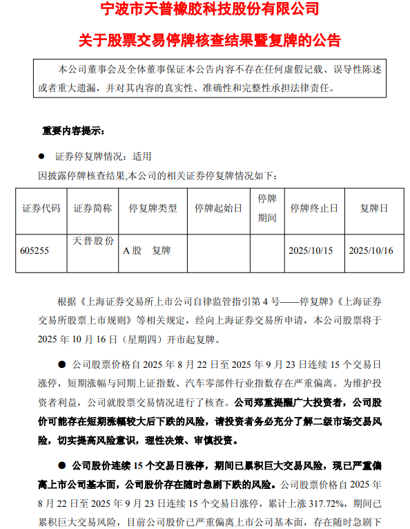 10月15日晚,天普股份公告称,近期,公司就股票交易异常波动及严重异常波动的相关事项进行了核查。鉴于相关核查工作已完成,经申请,公司股票将于10月16日开市起复牌。