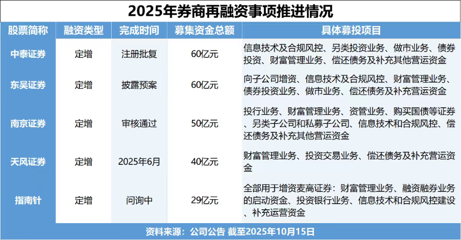 2025年以来,多家券商密集推进定增计划,形成明显的“补血”潮。其中,指南针(300803.SZ)5月更新29亿元定增方案修订稿;天风证券(601162.SH)6月23日完成40亿元定增募资;东吴证券(601555.SH)7月10日公布60亿元定增预案,成为年内首家公布定增计划的券商;南京证券(601990.SH)50亿元定增也于9月29日获上交所审核通过。
