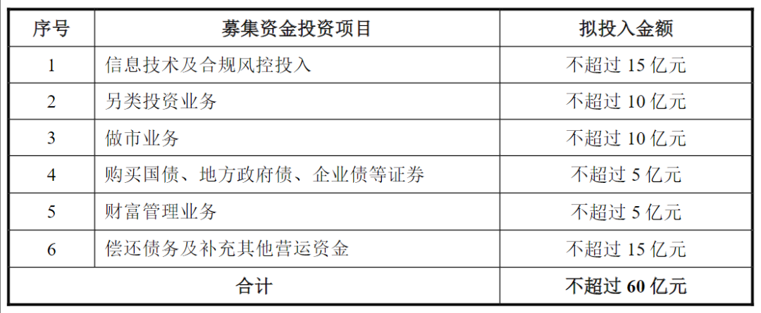 具体募集资金投向来看,信息技术及合规风控(15亿元)、另类投资(10亿元)、做市业务(10亿元)、债券投资(5亿元)、财富管理(5亿元)及偿还债务(15亿元)。