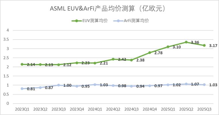 如果以收入结构回推估算,三季度单台EUV均价(含服务)约为3.17亿欧元,环比下降了5.4%左右,ArFi产品单台均价下降了3.4%左右,EUV及ArFi产品经历了连续三个季度均价增长后的首次回落,不过仍然处于相对高位。