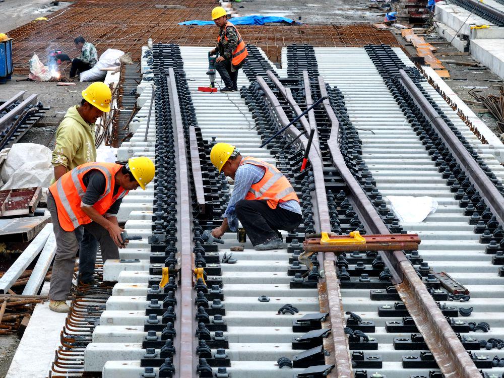 图为在安徽省蒙城县境内阜淮铁路建设现场,工人正在加紧施工作业。(图片由CNSPHOTO提供)