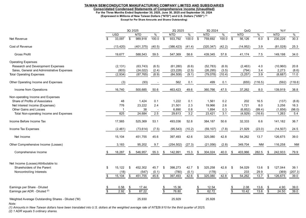 10月16日,台积电公布了2025年第三财季业绩,期内营收和净利润均创历史新高:合并营收9899.2亿元新台币(约合人民币2303亿元),同比增加30%,高于市场预期的9677亿元新台币;净利润4523亿元新台币(约合人民币1052亿元),同比增加39%,高于市场预期的4055亿元新台币;每股盈余17.44元新台币,同比增加39%。公司第三季度毛利率为59.5%。
