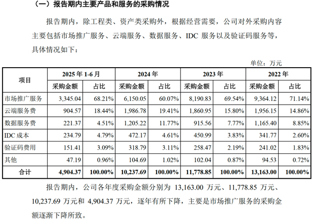 为了维系用户增长,企查查在营销上投入不菲。2022年至2025年上半年,公司销售费用分别为1.32亿元、1.26亿元、1.13亿元和6098.95万元,累计超4亿元,同期,占营业收入的比例分别为25.37%、20.42%、15.88%和16.25%。其中六成用于线上推广。