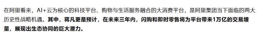 据《格隆汇》等多家媒体报道,蒋凡预测,未来三年闪购和即时零售将为阿里带来1万亿交易增量,其本质不是规模扩张,而是通过生态协同重构人、货、场的匹配效率。