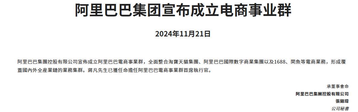 2024年11月,阿里成立电商事业群,由蒋凡统管淘宝、天猫、国际业务、1688、闲鱼等板块;2025年6月,饿了么与飞猪并入该事业群,形成覆盖实物电商、即时零售、旅行服务的超级平台。