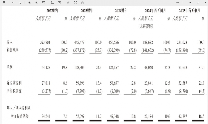 2025年前5个月营收为2.31亿元,上年同期的营收为1.9亿元,同比大涨超200% ;期内利润为4280万元,上年同期的期内利润为2019万元,仅五个月已赚回2024年全年利润的86.7%。2025年前5个月营收中,来自贵金属手表的营收为1.15亿元,占营收的比例为49.9%;来自贵金属饰品及产品收入为1.08亿元,占比为46.6%。