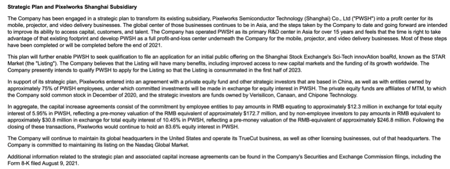 2021年,Pixelworks宣布对上海研发中心(PWSH)的重组计划,旨在加速将PWSH转型为其移动、投影仪和视频传输业务的利润中心,因为这些业务的全球中心在亚洲。彼时公司方面披露,希望让PWSH有资格在2023年上半年在中国科创板进行IPO。