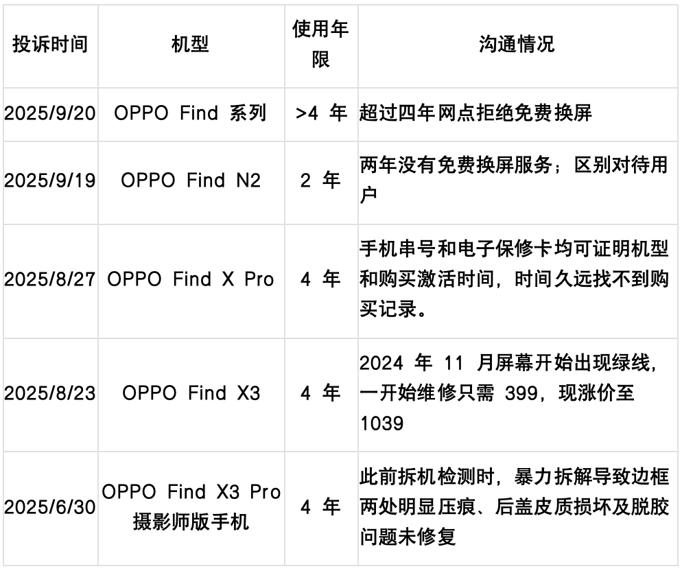 一位使用Find X3 Pro摄影师版的用户遭遇尤具代表性:手机2021年9月激活,2025年6月突现绿线。按OPPO此前承诺,激活四年内可免费更换屏幕并延保,但广州售后却以“无购买记录”为由拒保。更离谱的是,检测过程中因操作粗暴导致边框压痕、后盖皮质脱胶,检测后,在未进行修理的情况下便原样退回。