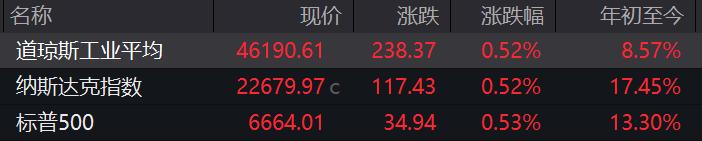截至收盘,道指涨0.52%报46190.61点,标普500指数涨0.53%报6664.01点,纳指涨0.52%报22679.97点。本周,道指涨1.56%,标普500指数涨1.7%,纳指涨2.14%。