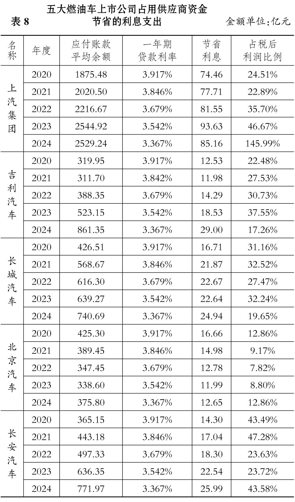 其中,上汽集团2024年占用供应商资金的效果最为突出:2529.24亿元的资金占用节省利息支出85.16亿元,占其税后利润的比例高达145.99%。倘若没有OPM战略带来的利息支出节约效应,上汽集团2024年的经营将由盈转亏。