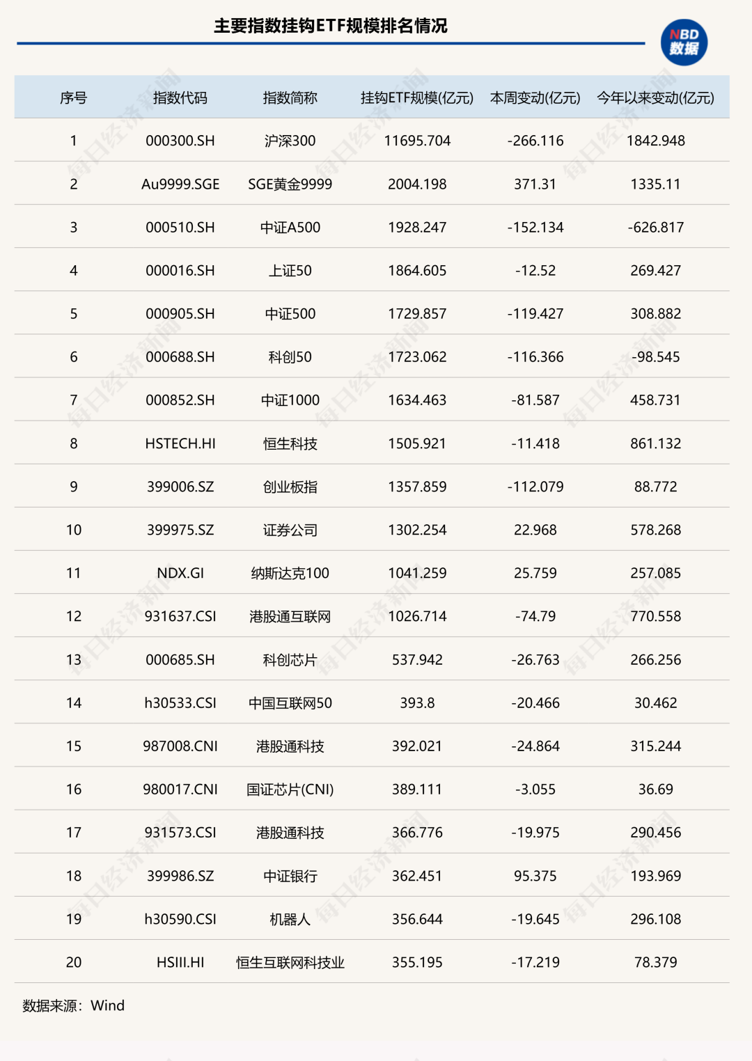 5只宽基指数挂钩ETF规模本周缩水超100亿元