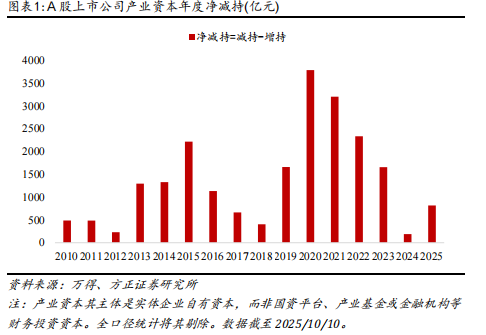 从年度数据来看,2010年至2025年10月10日期间,产业资本净减持(减持减去增持)整体呈现“2015年与2020年双峰突出、之后逐步回落”的格局。具体来看,2015年净减持为2,219亿元,2020年进一步攀升至样本期间最高点3,791亿元,随后在2021–2023年依次回落至3,208亿元、2,338亿元和1,659亿元,2024年大幅降至188亿元,而2025年截至10月10日则为817.8亿元。规模对比显示,2025年迄今的净减持规模仅相当于2015年的36.8%、2020年的21.6%,反映今年产业资本减持力度仍明显弱于典型牛市阶段。从结构演变来看,以往两轮牛市往往伴随“净减持快速冲高至区间峰值”的特征,而2025年更多呈现为对2024年低位水平的温和修复,尚未形成接近历史牛年级别的高强度减持态势。