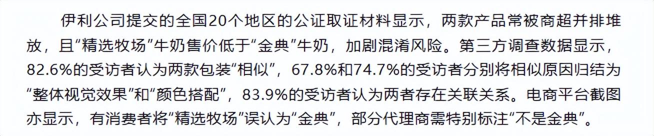 在混淆可能性认定方面,上述案件确立了“客观现实与潜在可能性并重”的标准。江苏高院强调,“既要考虑客观现实的混淆,也要考虑混淆的可能性”。据《沁县政法》公众号报道,伊利提交的电商平台用户评论显示,有消费者将蒙牛“精选牧场”误认为伊利“金典”产品,部分代理商甚至需要特别标注“不是金典”。此外,第三方调查数据显示,82.6%的受访者认为两款包装“相似”,83.9%的受访者认为两者存在关联关系。这些证据形成了完整的证明链条,为混淆可能性的认定提供了有力支持。