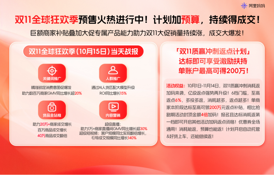 为助力商家在双11全周期内实现更大的突破,阿里妈妈30亿补贴红利持续发放中,商家参与阿里妈妈“双11质赢冲刺返点计划”等活动,可享200万反哺补贴,其中,万相台AI无界营销激励计划下,单个客户最高可得260万。这不仅是真金白银的激励,更是为更关键的大促后半程注入的一剂“确定性”强心针,为商家的全域生意爆发提供源源不断的动能。