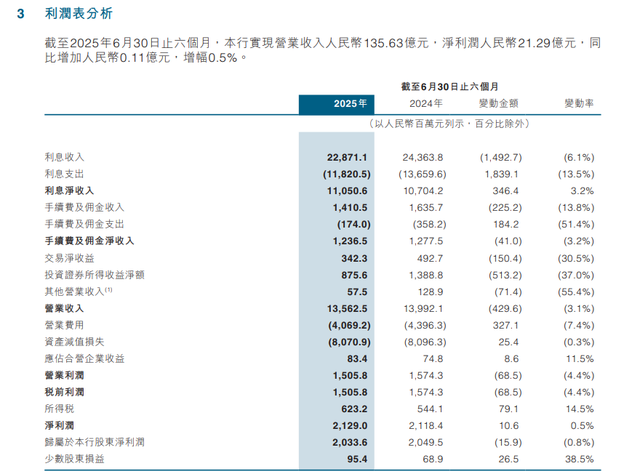 2025年上半年,中原银行实现营业收入135.63亿元,同比下降3.07%,实现净利润21.29亿元,与2024年同期相比基本持平,但归母净利润同比减少0.78%。