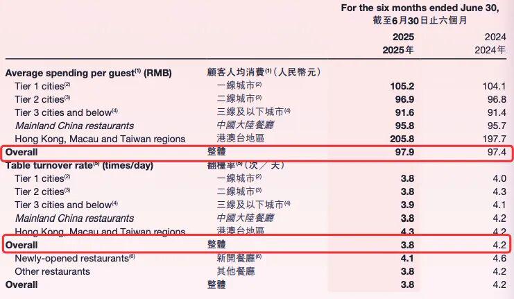 财报数据显示,2025年上半年,海底捞的人均消费不仅没有下降,反而微涨0.5%,达到97.9元;一线城市更是上涨1.1%,达到105.2元——这说明问题不在价格。