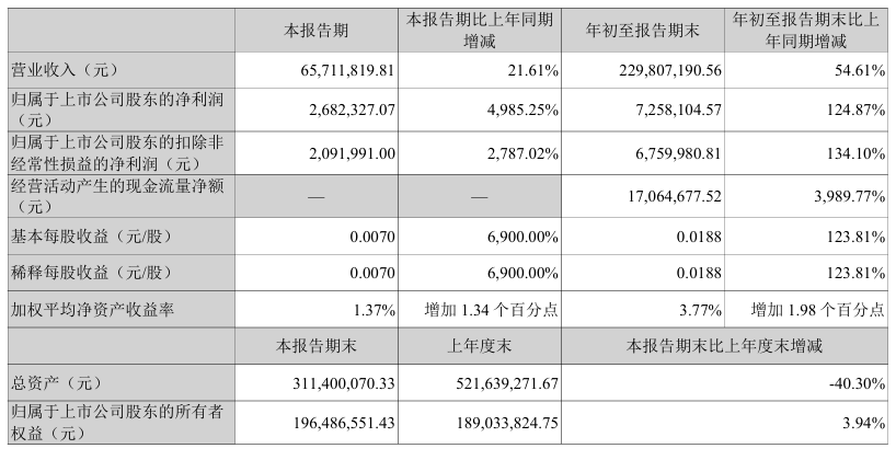 公司前三季度营收为2.30亿元,同比增长54.61%;净利润为725.81万元,同比增长124.87%。