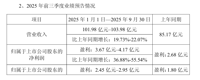 业绩预告显示,2025年前三季度归属于上市公司股东的净利润、归属于上市公司股东的扣除非经常性损益的净利润较上年同期有较大幅度的增长,主要系客户份额提升、持续推进精细化运营带来的成本费用管控优化等综合因素所致。