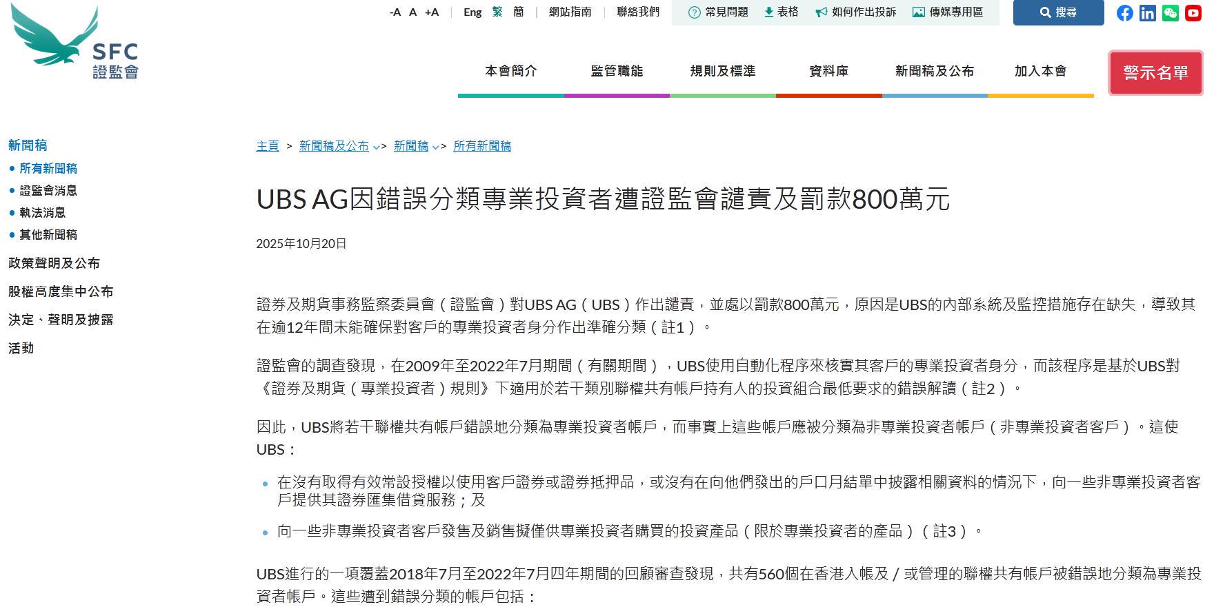 香港证监会称,对UBS AG(UBS)作出谴责,并处以罚款800万元,原因是UBS的内部系统及监控措施存在缺失,导致其在逾12年间未能确保对客户的专业投资者身份作出准确分类。