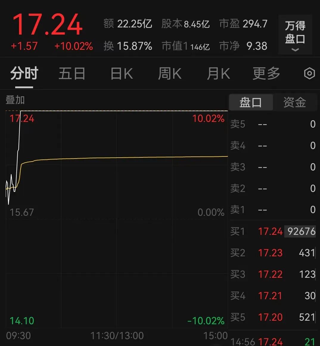 万润科技今日涨停,全天成交额超22亿元,截至收盘,涨停板上封单仍超9万手。