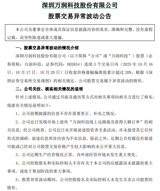 10月20日晚间,万润科技发布股票交易异常波动公告称,公司近日发现市场上流传“万润科技线上反路演及获得大额订单”的相关信息,经公司核查,公司近日未开展前述投资者关系活动、亦未接受其它任何形式的调研,前述信息所涉内容为不实信息。除此之外,近期公共传媒没有报道可能或已经对公司股票交易价格产生较大影响的未公开重大信息。