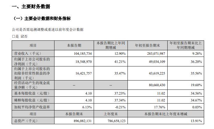 2025年前三季度,宁德时代实现营业收入2830.72亿元,同比增加9.28%;归属于上市公司股东的净利润490.34亿元,同比增加36.20%。