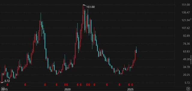 股价从2021年9月份的高位,一直跌了3年,真的是腰斩后再腰斩,从近10年的表现来看,华友钴业完美的诠释了什么是周期。