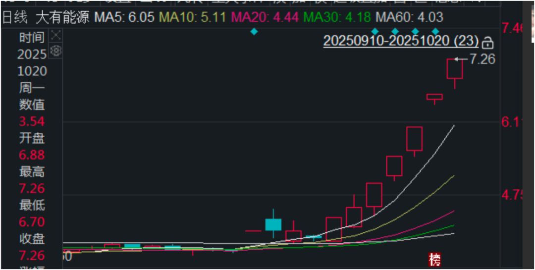 截至10月20日,大有能源股价再次涨停,达7.26元/股。按此计算,短短7个交易日,公司从10月10日至10月20日,股价涨幅高达85.2%,期间6天收涨停板。
