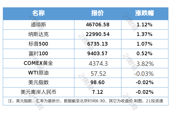 纽约股市三大股指10月20日上涨。截至当天收盘,道琼斯工业平均指数比前一交易日上涨515.97点,收于46706.58点,涨幅为1.12%;标准普尔500种股票指数上涨71.12点,收于6735.13点,涨幅为1.07%;纳斯达克综合指数上涨310.57点,收于22990.54点,涨幅为1.37%。