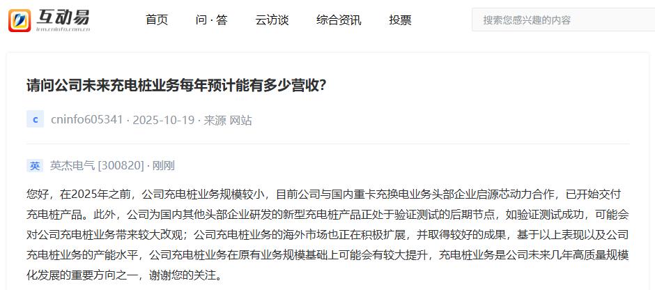 【V观财报|英杰电气:已开始交付充电桩产品】英杰电气10月21日在投资者互动平台回复提问表示,在2025年之前,公司充电桩业务规模较小,目前公司与国内重卡充换电业务头部企业启源芯动力合作,已开始交付充电桩产品。此外,公司为国内其他头部企业研发的新型充电桩产品正处于验证测试的后期节点,如验证测试成功,可能会对公司充电桩业务带来较大改观;公司充电桩业务的海外市场也正在积极扩展,并取得较好的成果,基于以上表现以及公司充电桩业务的产能水平,公司充电桩业务在原有业务规模基础上可能会有较大提升,充电桩业务是公司未来几年高质量规模化发展的重要方向之一。(中新经纬APP)