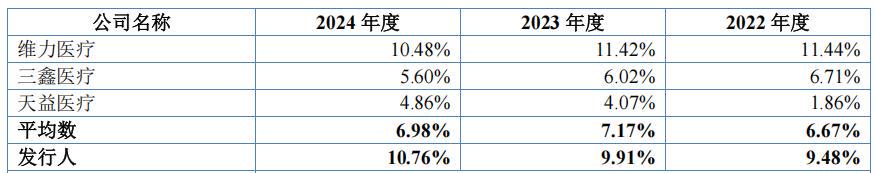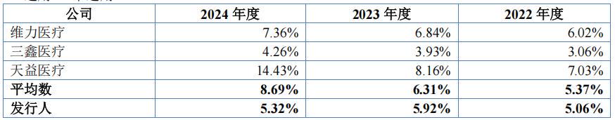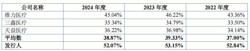 2022年-2024年,海圣医疗主营业务毛利率分别为52.84%、53.15%和52.07%,高于可比同行均值37%、39.33%和38.87%。