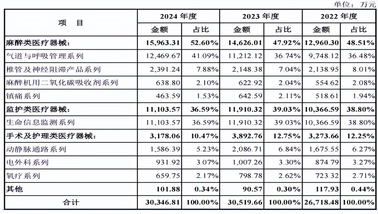 其中,公司麻醉类产品销售占比相对较高,报告期各期,公司麻醉类耗材分别实现销售收入1.296亿元、1.463亿元和1.596亿元,占各期主营业务收入比重分别为48.51%、47.92%和52.60%;公司监护类产品分别实现销售收入1.037亿元、1.191亿元和1.11亿元,占各期主营业务收入比重分别为38.80%、39.03%和36.59%。