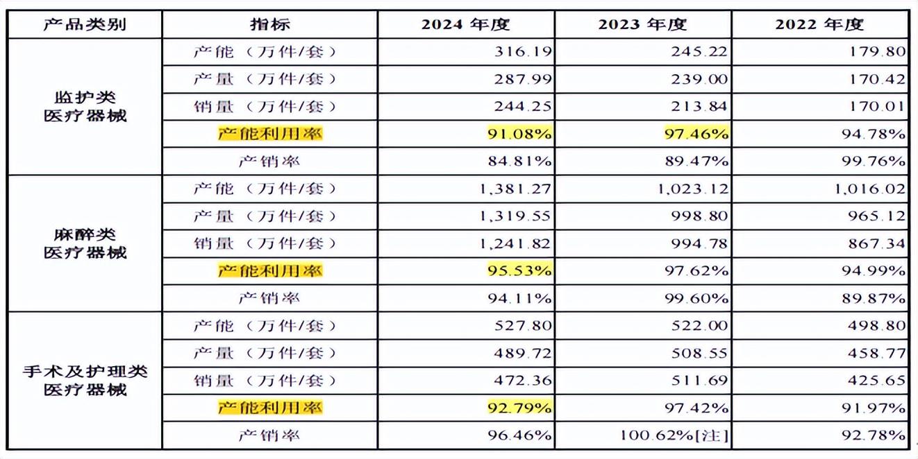 2024年,海圣医疗主营监护类、麻醉类、手术及护理类医疗器械产能利用率、产销率均存在下滑情形。