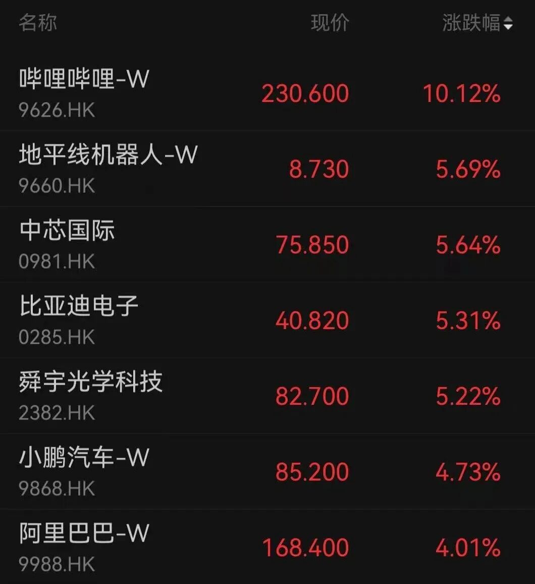 科网股表现强势,哔哩哔哩涨超10%,中芯国际、比亚迪电子涨超5%,小鹏汽车、阿里巴巴涨超4%。