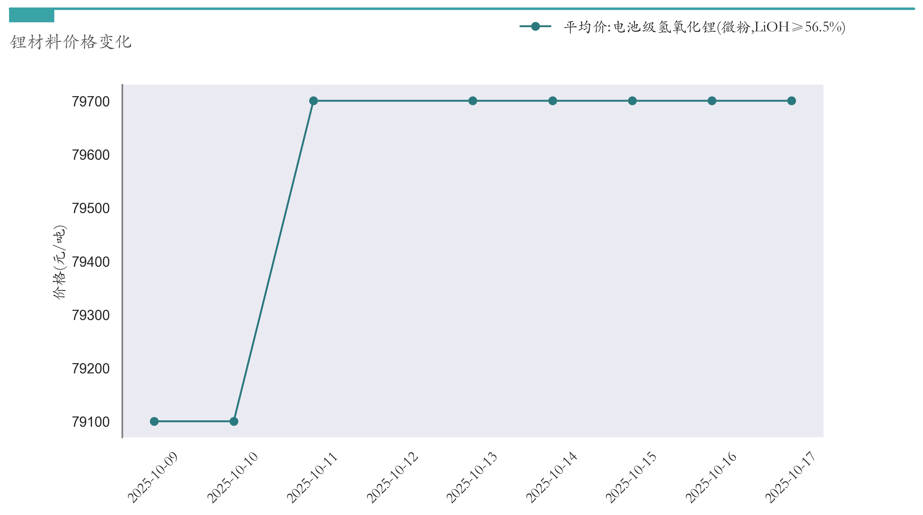 截至10月17日,电池级氢氧化锂平均报价为79700元/吨,较10月10日上涨600元/吨。近两周氢氧化锂价格变化如下图所示: