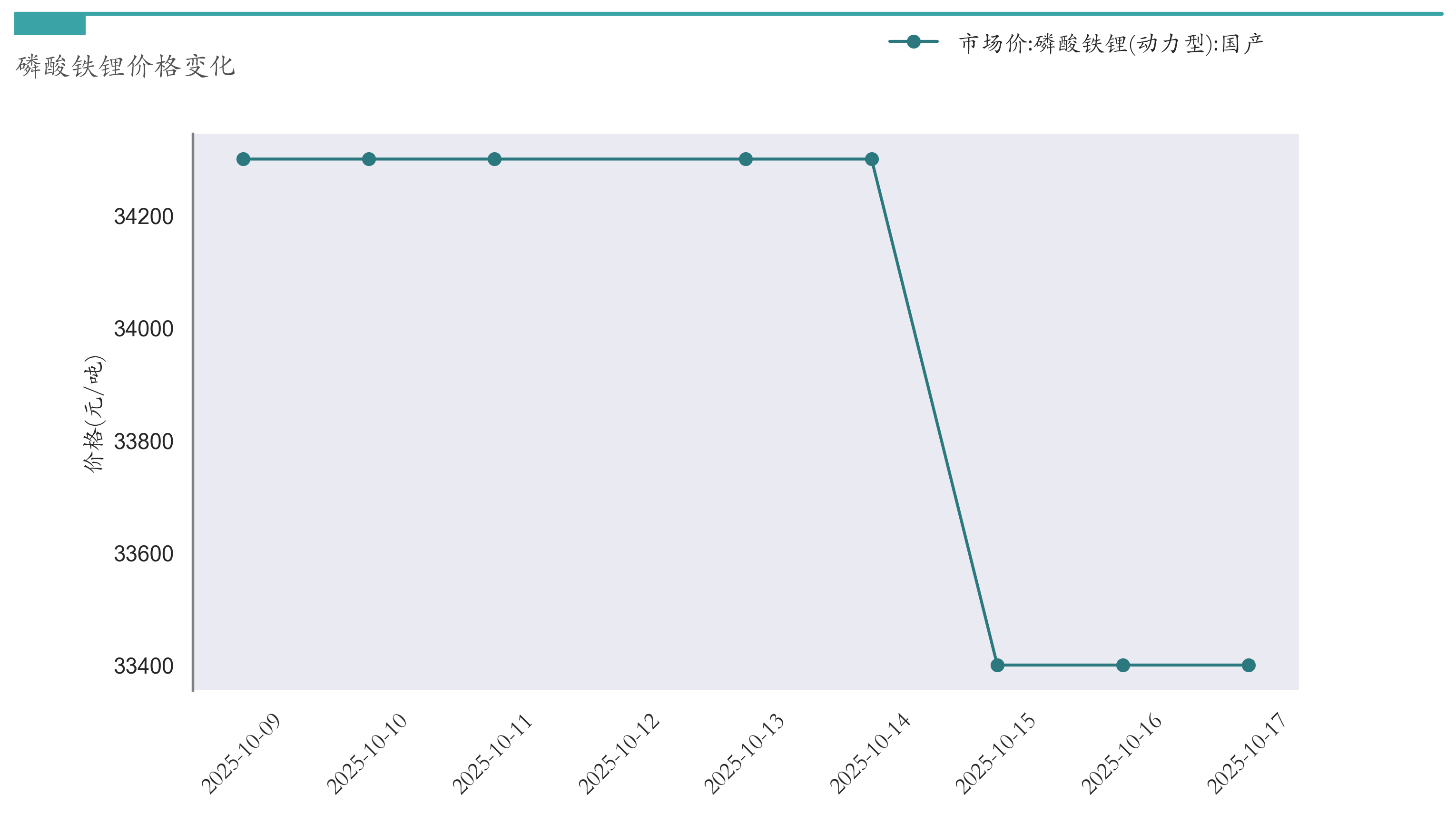 截至10月17日,磷酸铁锂市场报价为33400元/吨,较10月10日下跌900元/吨。近两周磷酸铁锂价格变化如下图所示: