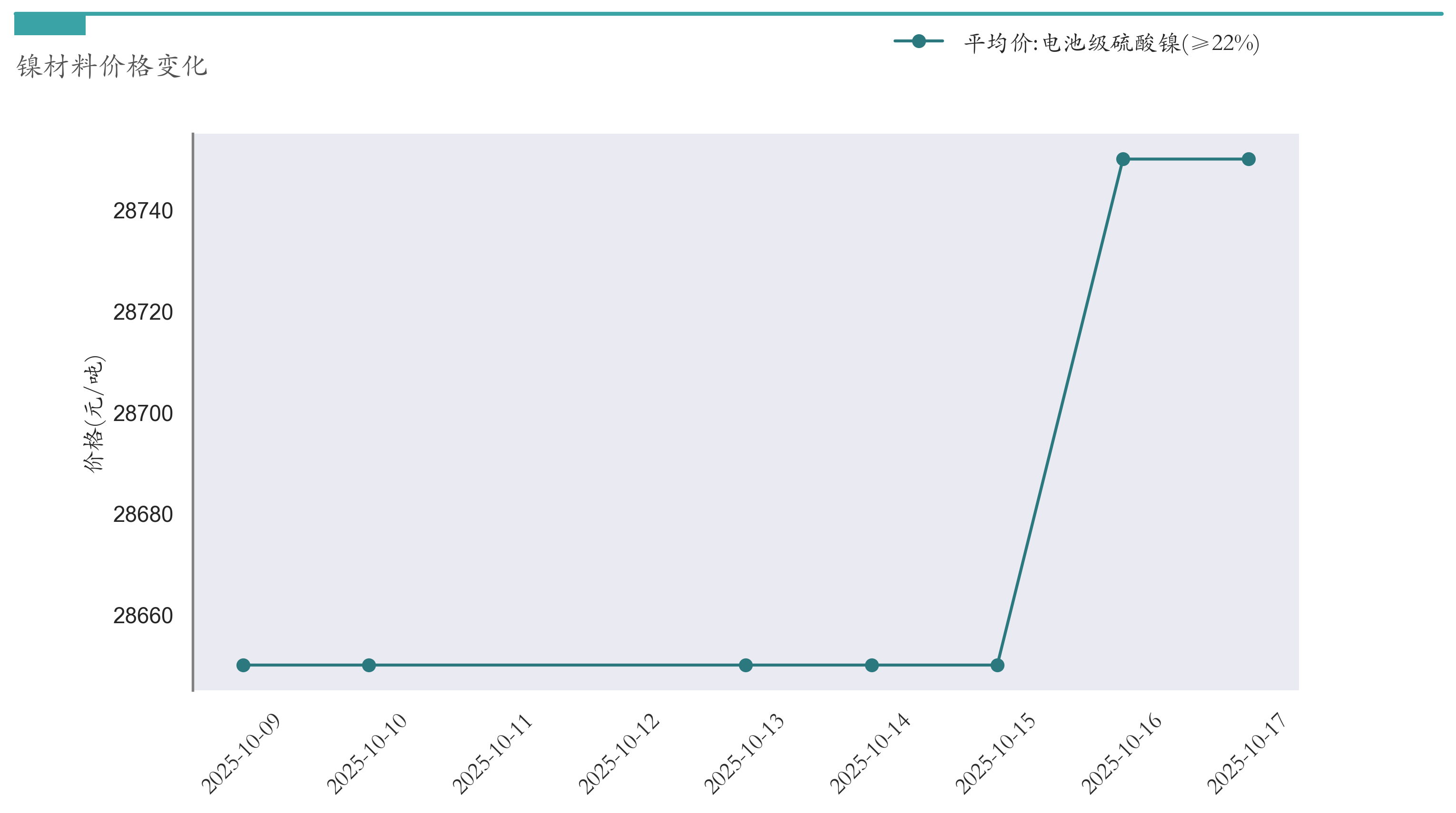 截至10月17日,电池级硫酸镍平均报价为28750元/吨,较10月10日上涨100元/吨。近两周镍材料价格变化如下图所示: