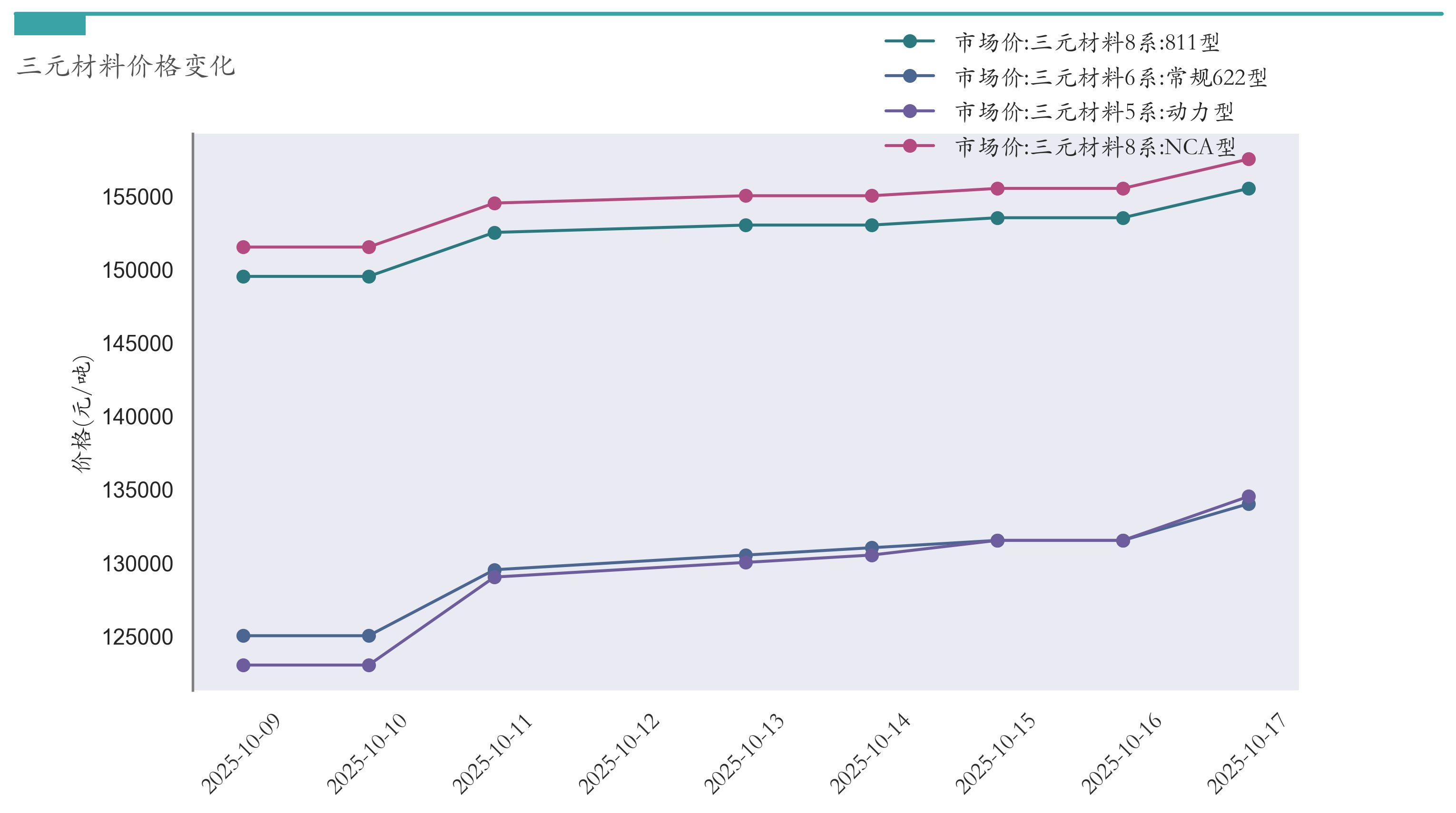 截至10月17日,三元材料8系:811型市场报价为155500元/吨,较10月10日上涨6000元/吨。三元材料8系:NCA型市场报价为157500元/吨,较10月10日上涨6000元/吨。三元材料6系:常规622型市场报价为134000元/吨,较10月10日上涨9000元/吨。三元材料5系:动力型市场报价为134500元/吨,较10月10日上涨11500元/吨。近两周三元材料价格变化如下图所示:
