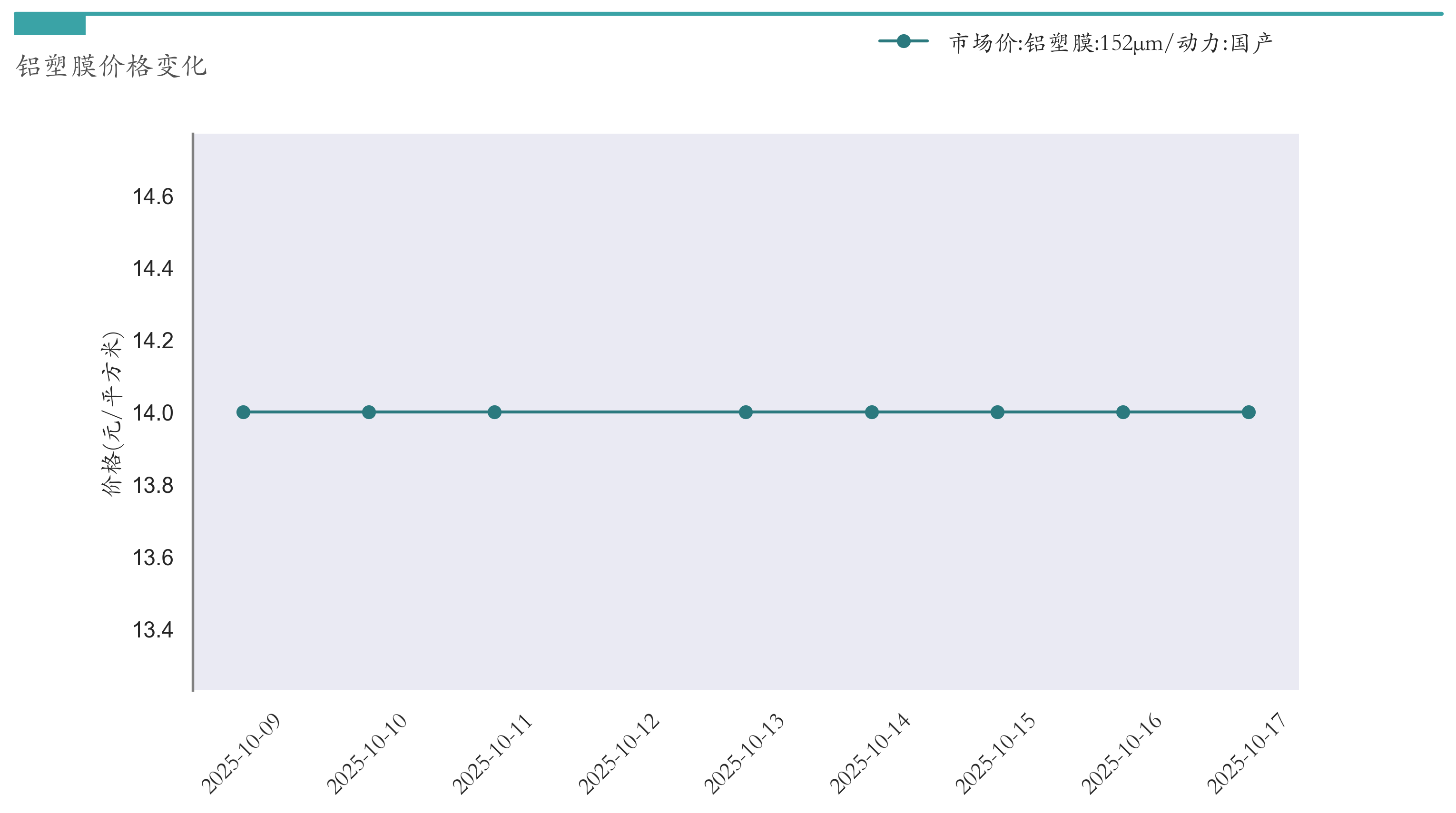 截至10月17日,152μm铝塑膜市场报价为14元/平方米,较10月10日持平。近两周铝塑膜价格变化如下图所示: