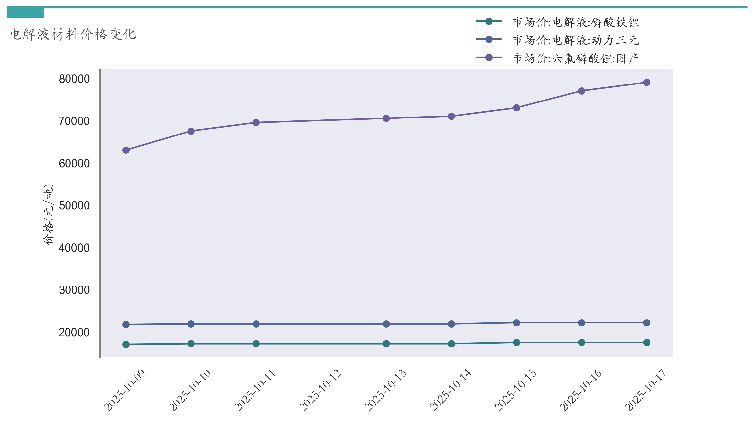 截至10月17日,六氟磷酸锂市场报价为79000元/吨,较10月10日上涨11500元/吨。电解液(磷酸铁锂)市场报价为17450元/吨,较10月10日上涨300元/吨。电解液(动力三元)市场报价为22150元/吨,较10月10日上涨300元/吨。近两周电解液材料价格变化如下图所示: