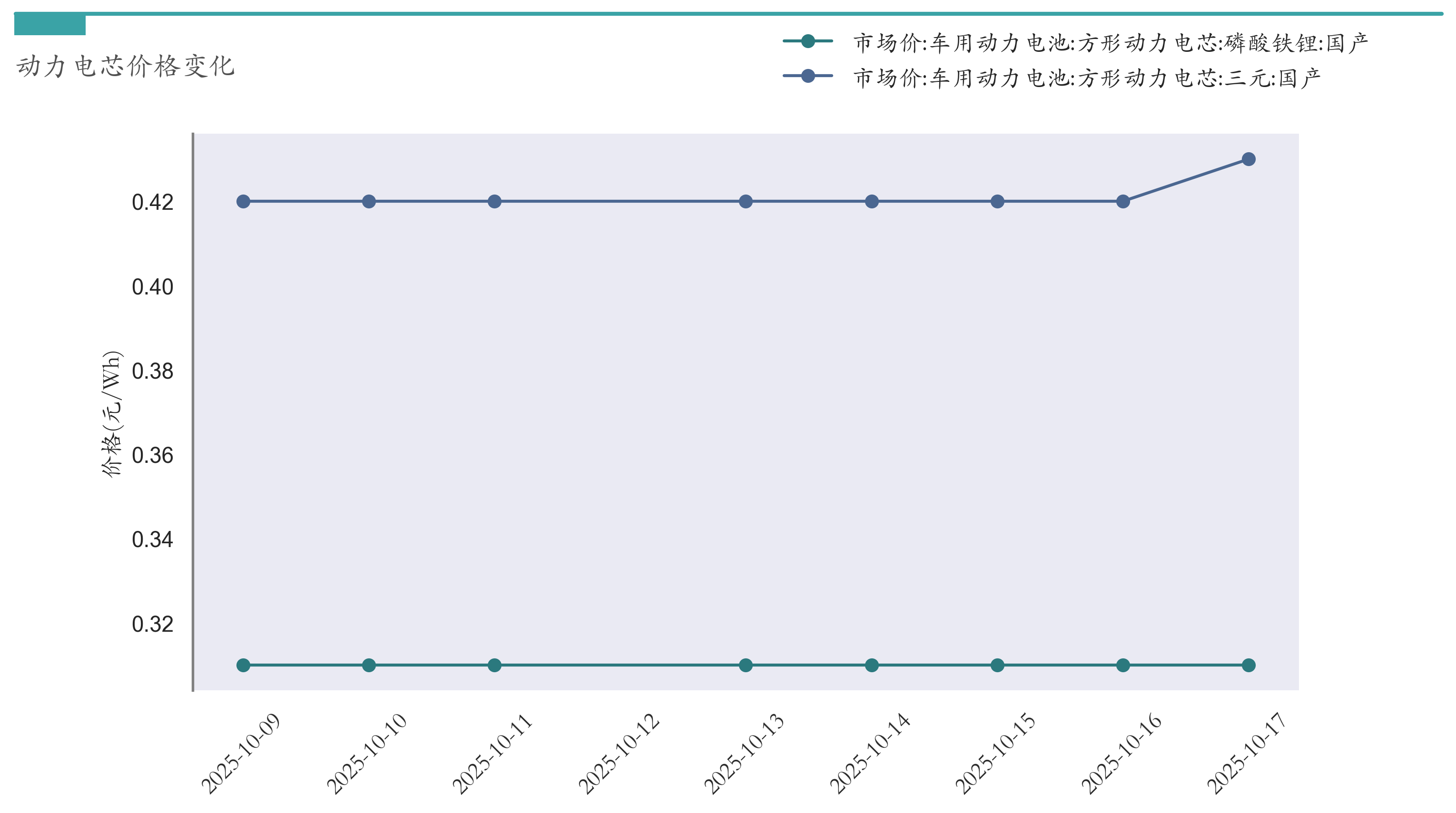 截至10月17日,方形动力电芯(磷酸铁锂)市场报价为0.31元/Wh,较10月10日持平。方形动力电芯(三元)市场报价为0.43元/Wh,较10月10日上涨0.01元/Wh。近两周动力电芯价格变化如下图所示: