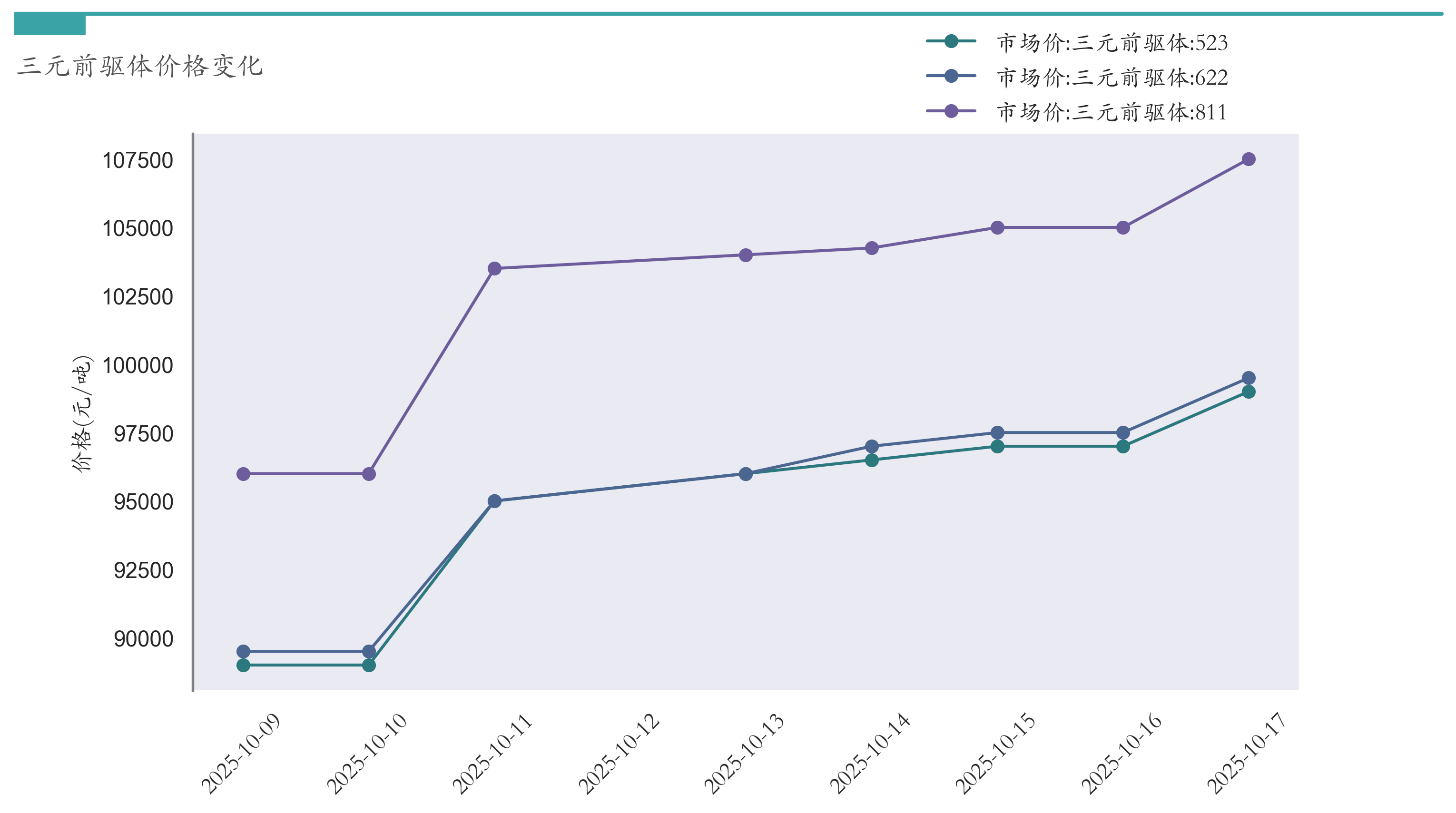 截至10月17日,三元前驱体811市场报价为107500元/吨,较10月10日上涨11500元/吨。三元前驱体622市场报价为99500元/吨,较10月10日上涨10000元/吨。三元前驱体523市场报价为99000元/吨,较10月10日上涨10000元/吨。近两周三元前驱体价格变化如下图所示: