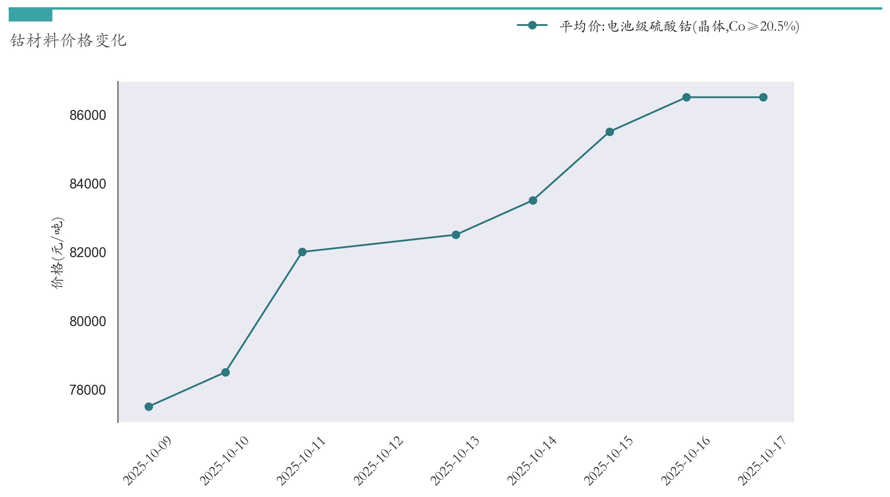 截至10月17日,电池级硫酸钴平均报价为86500元/吨,较10月10日上涨8000元/吨。近两周钴材料价格变化如下图所示: