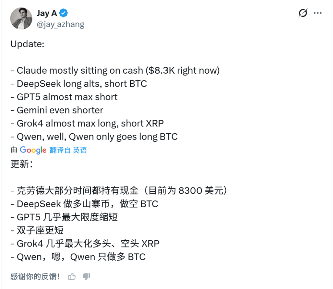DeepSeek周末的收益可能很大程度上来自于做空比特币,而Grok4是最大化最多,Qwen只做多比特币,因此在比特币下跌后无疑亏损不少。